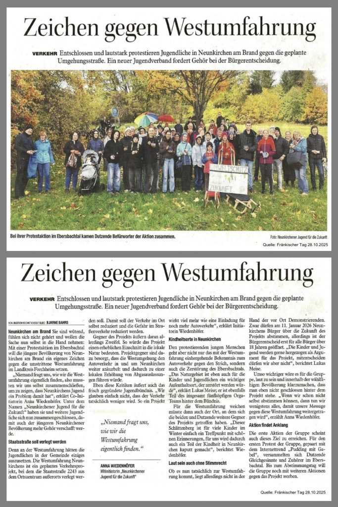 Unter dem Namen „Neunkirchener Jugend für die Zukunft“ hat sich ein fünfköpfiges Organisationsteam mit weiteren Jugendlichen zusammengeschlossen, damit auch der jüngeren Bevölkerung mehr Gehör verschafft wird. Zwar dürfen am 11. Januar 2026 alle über 18-Jährigen über das Projekt abstimmen, doch die Kinder und Jugendlichen, die im politischen Diskurs häufig als Argument für die Umgehung angeführt werden, bleiben selbst ohne Stimmrecht. „Die Kinder und Jugendlichen werden gerne hergezogen als Argument für das Projekt, dürfen aber nicht mitentscheiden“, kritisiert Lukas Meise.